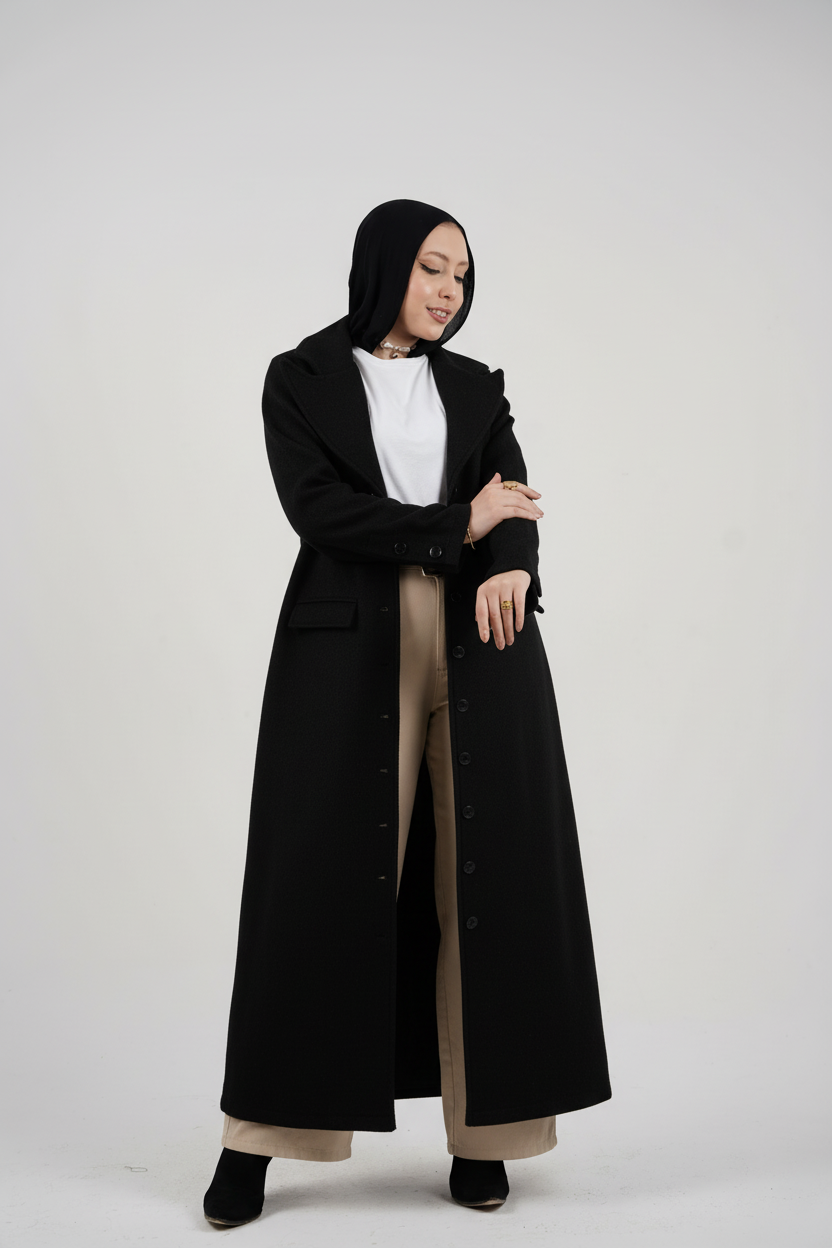 Featuring a full button-down front, tailored collar, and structured silhouette, it’s the perfect coat to elevate your modest winter wardrobe.