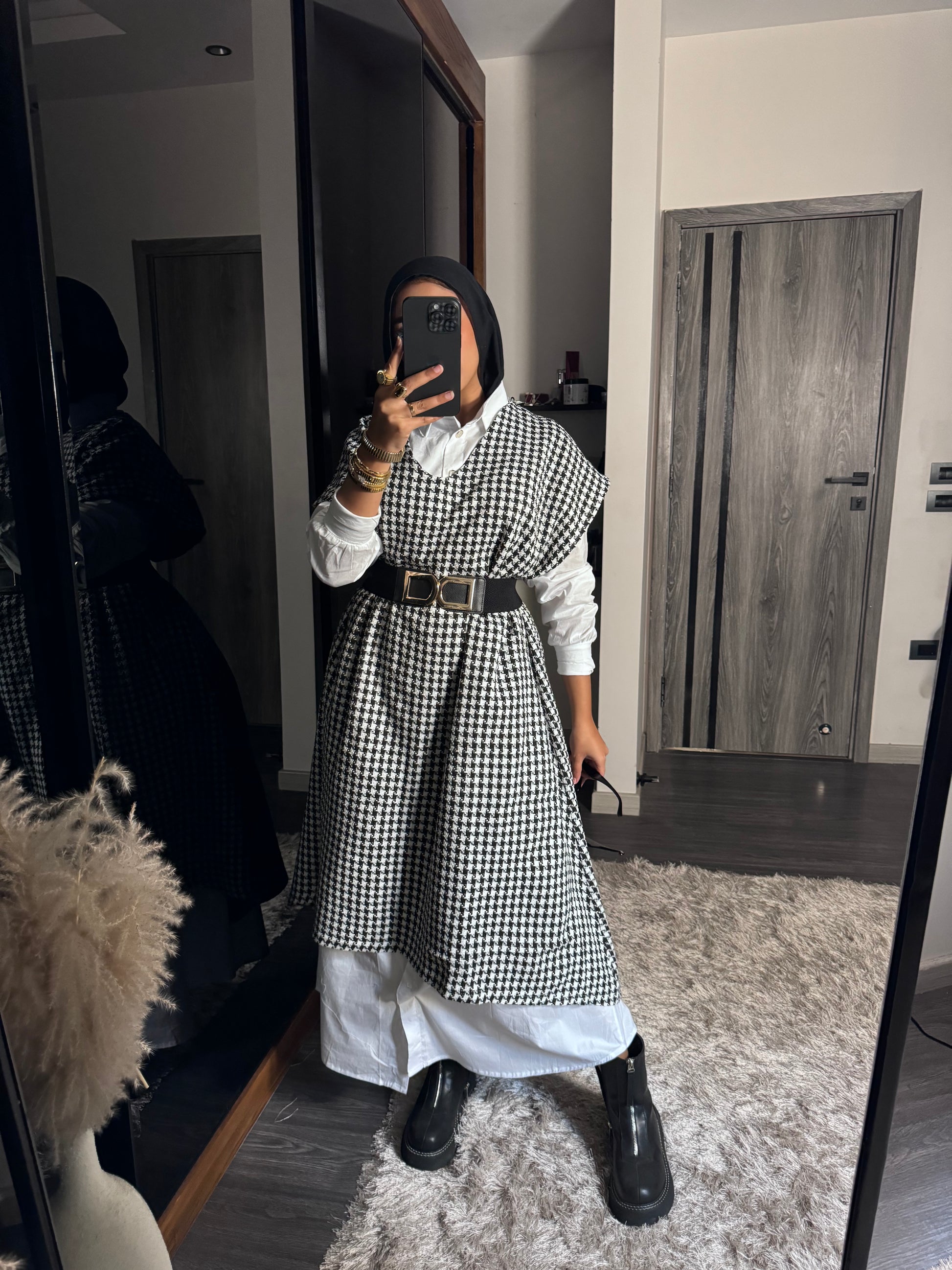 Hounds Tooth Overlay Dress: Sleeveless V-neck dress with a bold black-and-white hounds tooth pattern, exuding a chic vintage-inspired look.