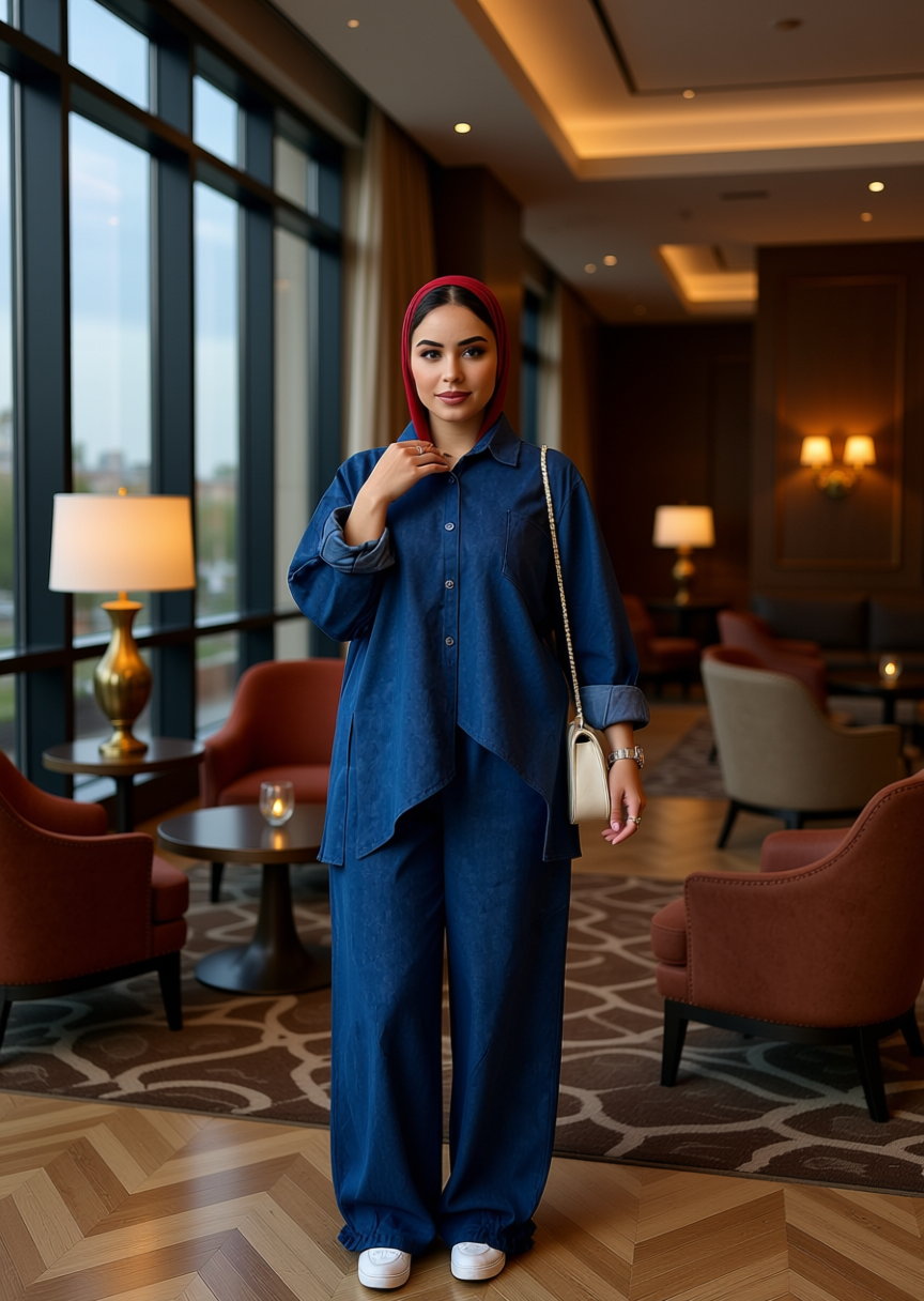 This two-piece denim outfit is designed to turn heads while keeping things modest and relaxed.