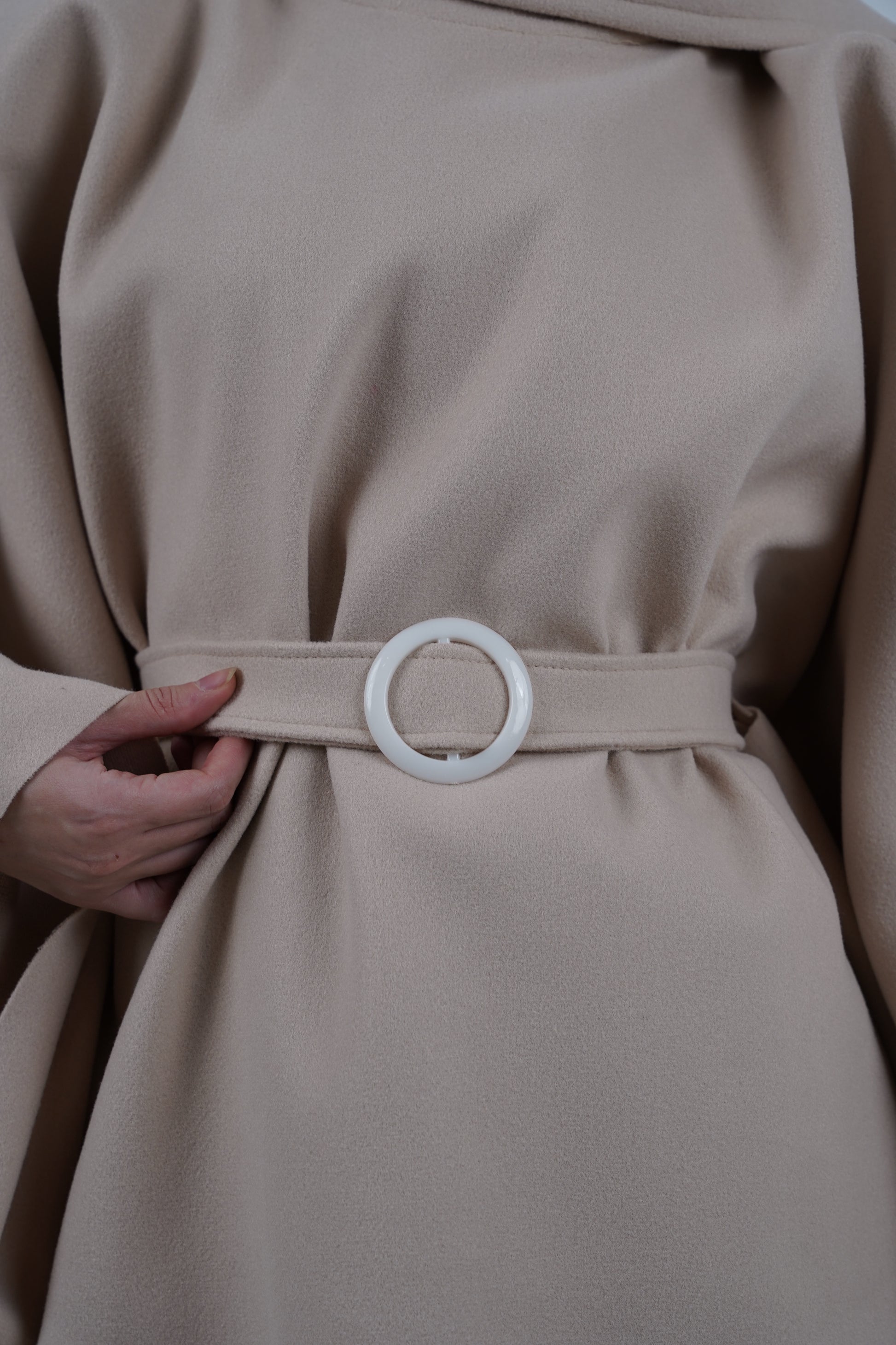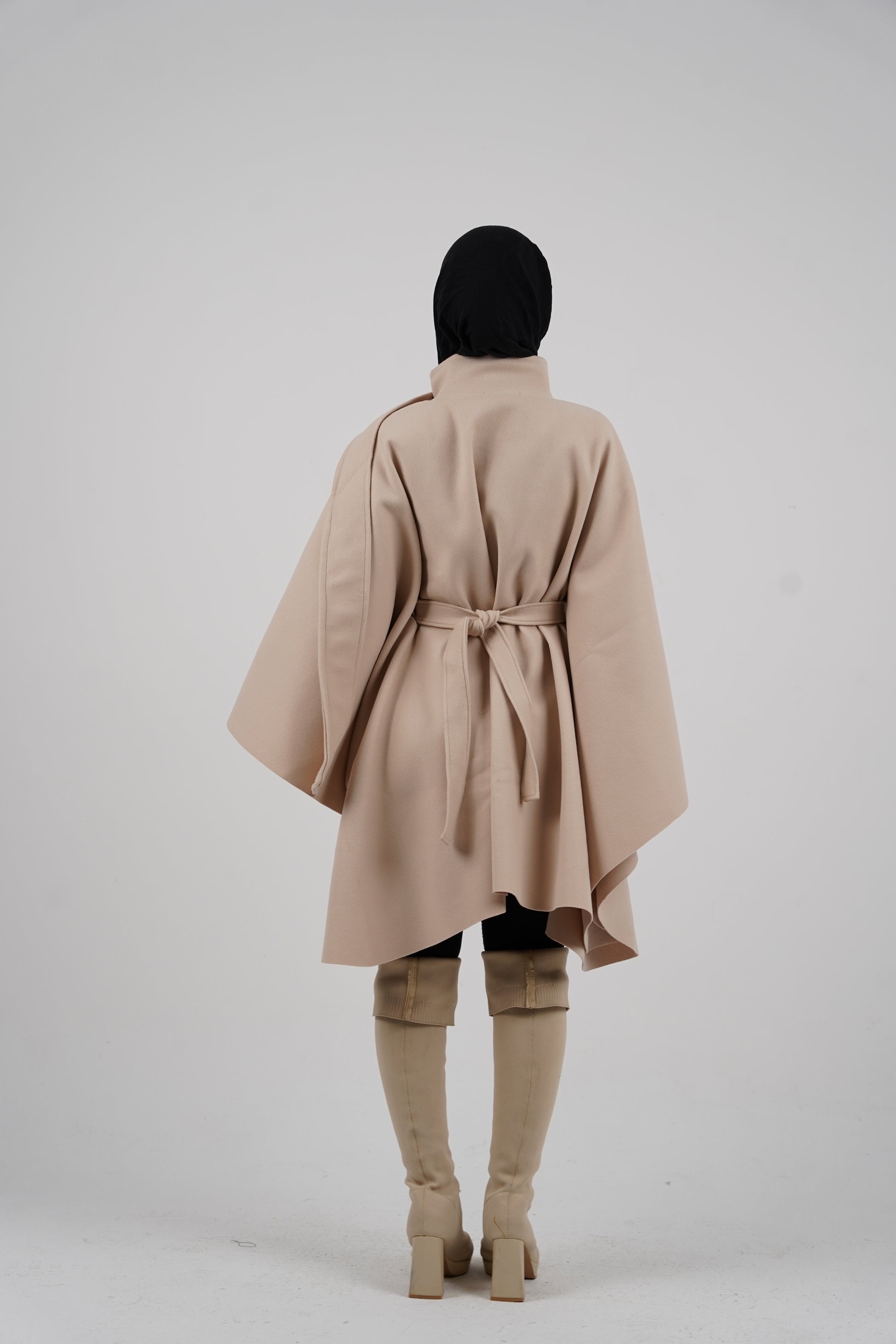 Designed in a one-size fit, this cape drapes effortlessly over any body shape, while the adjustable belt cinches the waist for a flattering silhouette. The neutral beige tone makes it the perfect layering essential for both casual days and sophisticated evenings.